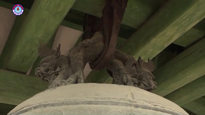 半球形の鐘のかん、つまり、鐘を吊り下げる所は、絡み合った2頭の竜、青竜と黄竜の彫りものからなっています。繊細な技法で竜の躍動感を現しています。