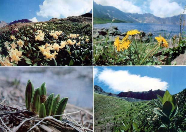ペクトゥ山の山頂から見下ろす天池の姿も見ごたえがあるものですが、湖畔の風致やはり、天下の絶勝です。湖畔には数百種の多様な植物が育っています。代表的なのは湖畔のどこでも目にするキバナシャクナゲです。湖畔の植物は強い風のため、葉や茎を上の方ではなく横に、地面を這うようにして伸ばします。ペクトゥ山の天池や湖畔に定着したり、季節に合わせて出入りしたりする動物も多くいます。