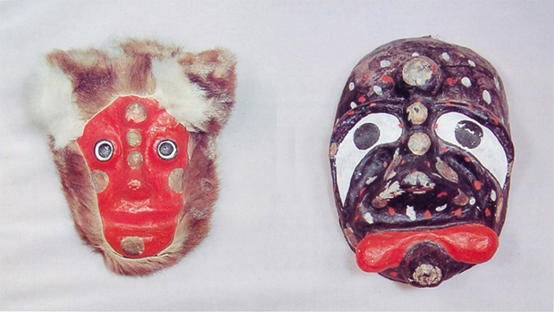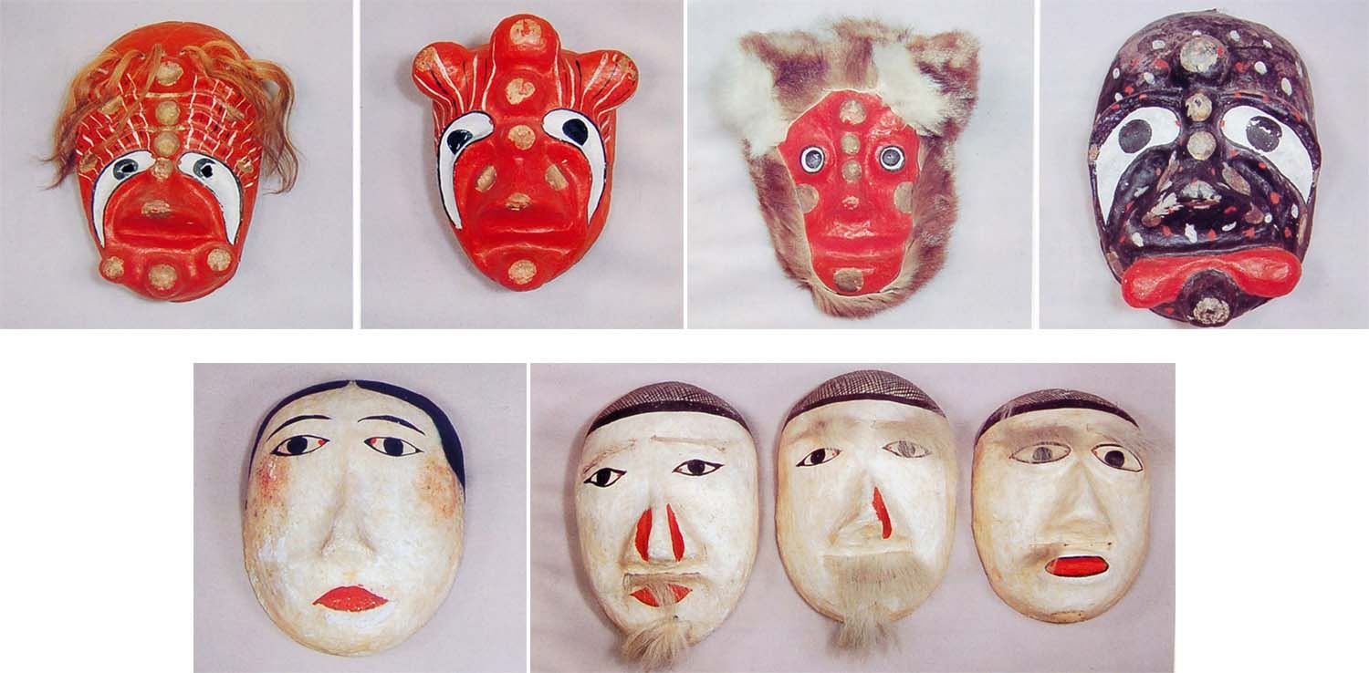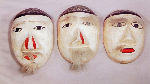 ポンサン仮面踊りは愉快で迫力のある朝鮮特有のリズムに合わせて踊ります。仮面は紙製ですが、製作法を見ますと、土で作った模型に朝鮮紙を幾重に張って日に干し、色を塗った後、表面ににかわをつけて艶を出します。また、反人民的な搾取社会の現実に反抗するかのように恐ろしい顔があれば、リャンバンなど腐り切った支配層を風刺する滑稽な顔もあります。