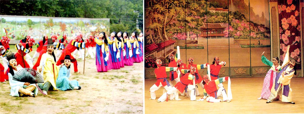 昔から、ファンヘ道は仮面踊りが盛んで、仮面踊りのところと呼ばれました。中でも、ポンサン地方のものが一番有名でした。ポンサン仮面踊りは、独特な踊りで封建社会での搾取階級の腐り切った生活を辛辣に風刺しています。また下層民の惨めな生活と幸福の願いも見せています。