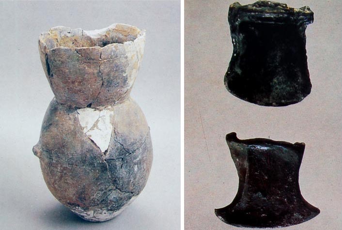 遺跡の下の層からは土器の欠片と共に鏃、玉石の装飾品などわずかな遺物が出土しました。上の層からは洞窟の天井から落ちた石と洞窟の奥の方から流れ出た10数固体分の人間の骨と遺物が出土しました。