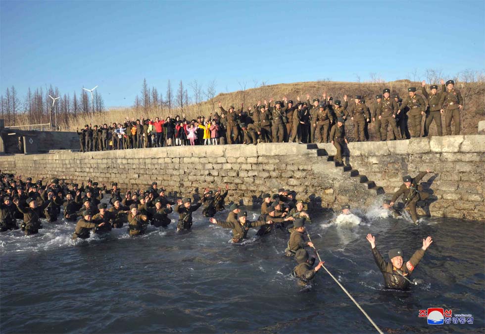 指揮官は、ついてくる軍人たちに振り向いて、どうしたら良いかまごつきました。金正恩委員長は、号令をかける前には帰るまいと言わんばかりに立ち尽くしていました。やっと、指揮官が喉を詰まらせて号令をかけました。けれど、軍人たちは従いませんでした。手を振りながら、冷たい水の中に飛び込む指揮官と軍人たち、つまずきながらも岸辺にどっと駆け出す家族と子供たち。