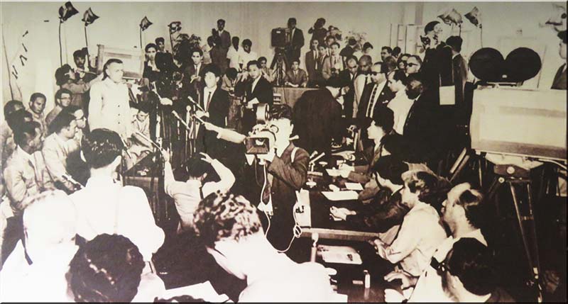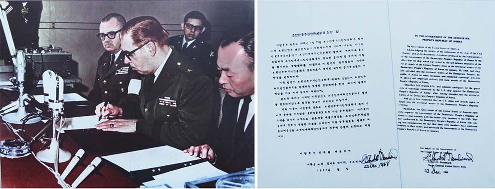 1968年12月23日、パンムンジョム会議でアメリカ政府を代表して、アメリカ陸軍少将ギルバート・エッチ・ウッドワードは謝罪文に署名して、共和国政府に提出しました。長々しい二つの文章に「朝鮮民主主義人民共和国」という尊厳ある国号が明記されたのは10回、アメリカの卑屈な弱腰に世界は驚きました。捕虜たちはパンムンジョムを通じて共和国領外へ追放され、これで11ヶ月間も長引いた「プエブロ」事件は幕を下ろしました。