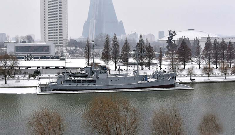 輸送船を改造し、海洋研究船を装った「プエブロ」は、アメリカ侵略軍の太平洋艦隊に所属され、スパイ活動を専門とする武装情報収集艦で、精鋭なスパイ機材を装備していました。83人の乗組員の殆どがスパイ活動の豊かな経験と技術を持っていました。拿捕当時、船には大口径機関銃と数十挺の狙撃兵器もありました。