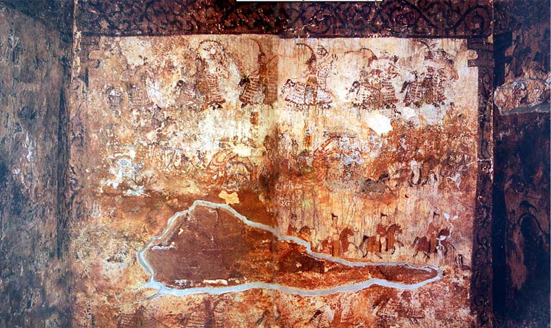 ご覧のように4人の弓取りと2人の審判員、1人の記録員が描かれている。壁画の右側に書かれた字は、「これは西側の中庭で馬に乗って弓術を競う『馬射戯』を見せるものだ」と言う内容の説明文である。