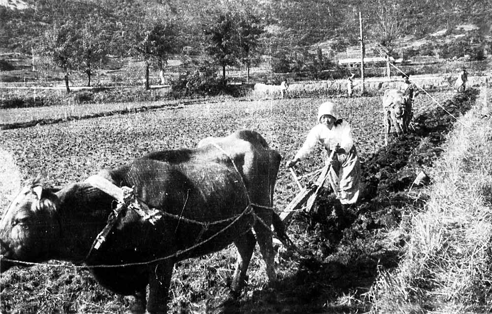 農村では、労力互助班と役牛共同利用班を組んで、人手と畜力の不足を補いました。女性たちも鋤を手に取りました。また、敵軍の砲弾の薬きょうとくず鉄で農具を作り、肥料を自力で生産しました。