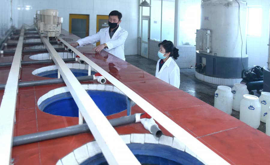 ピョンヤンにあるポトンガン有機質複合肥料工場には、ライン化した有機質複合肥料の生産工程が構築されています。工場では、ポトン川*1のへどろを基本原料として良質の有機質複合肥料といろいろな植物成長促進剤、生物農薬を生産しています。近年、この肥料の効果が農業現場で確証され、生産量は年々増えています。