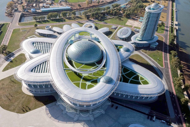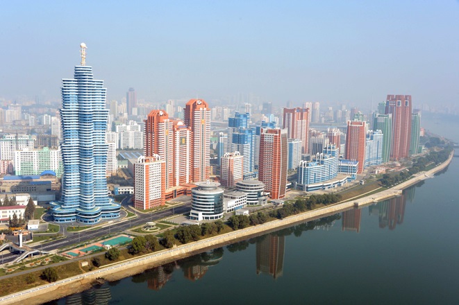 ピョンヤンには大建築をはじめ社会・文化観光の資源がとても豊かです。テドン川*5の岸辺に建てられたチュチェ思想塔*6の展望台に上がりますと、ピョンヤン市の美しい全景が一目に見渡されます。