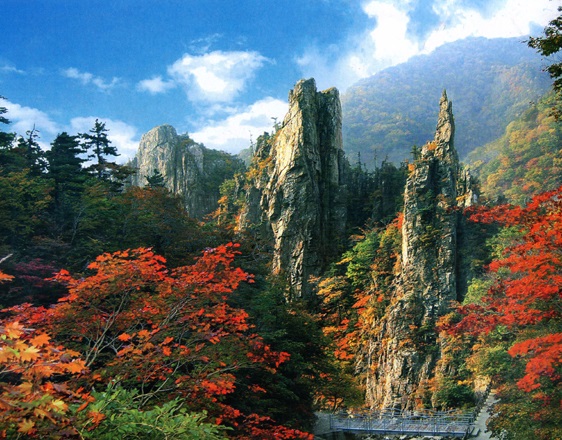 名勝の国として知られた朝鮮には名山もたくさんあります。四季を通して白雪を戴いて巍然とそびえているペクトゥ山*18、水晶のような清い水が流れ落ちる滝と絶妙な峰峰で天下の絶勝と呼ばれるクムガン山*19,そしてミョヒャン山*20とチルボ山*21、クウォル山*22など名山には自然の美しさがそのまま保存され、環境汚染がないので、なおも人々が関心を持っているようです。