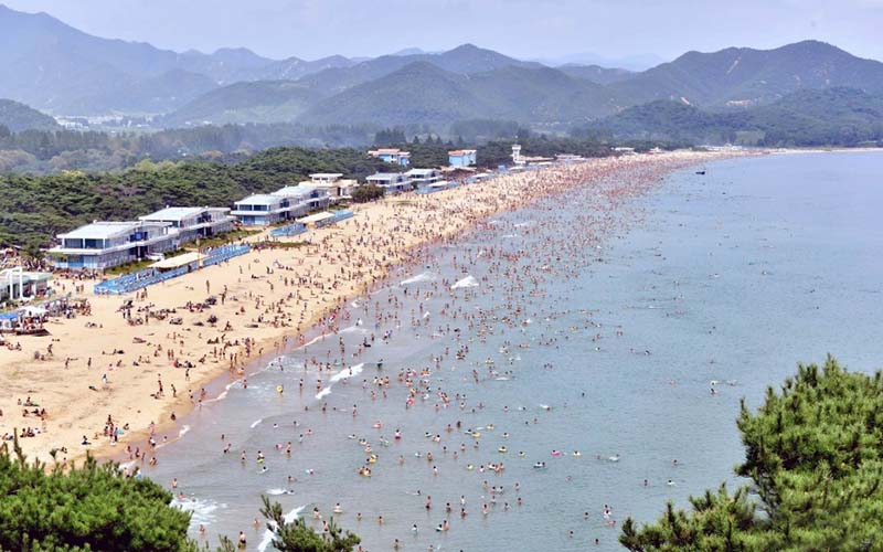 屏風のように並んだ高く低い山々に囲まれ、砂浜の海辺と適当な深さで清く穏やかな海水は海水浴場として最適です。周りの山々は、春には薄紅色のつつじの花、秋には赤く黄色のもみじで美しい景観を広げます。そして海岸線に沿って松と朝鮮五葉松、メタセコイヤなどが緑の林を成し、ハマナスとバラの花が海辺の風致をいっそう際立たせます。
