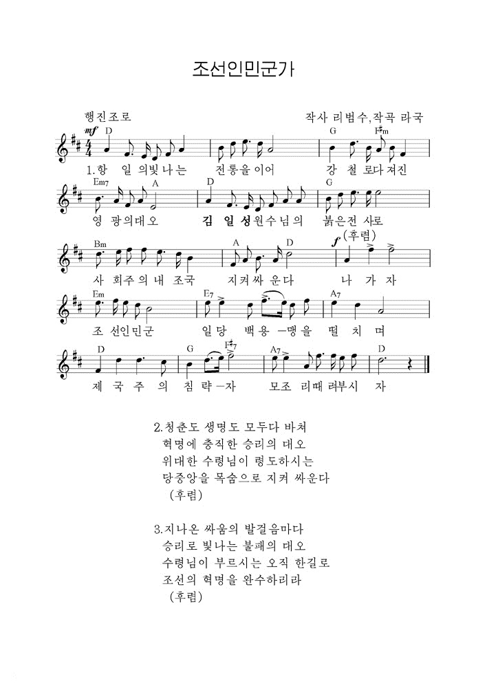 歌詞は、主席が20世紀前半、抗日革命闘争を繰り広げて成した輝かしい伝統を引き継いだ朝鮮人民軍の革命的性格を表しています。そして、国と人民を命がけで守る聖なる使命を持つ朝鮮人民軍の強い戦意と不抜の力を誇らしく歌いあげています。