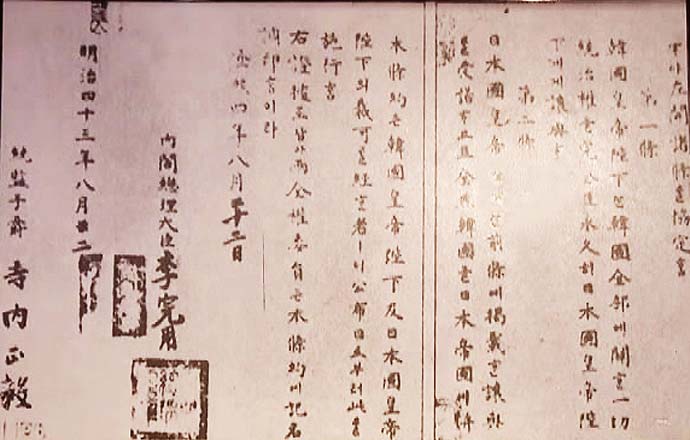 特に朝鮮の皇宮を二重三重に取り囲み、皇居と皇宮に出入りする朝鮮の官僚を恐喝しました。こうした状況下で日帝は「韓日併合条約」の捏造に取り掛かりました。日帝は朝鮮封建国家の最高統治者であるスンジョン皇帝が作成すべき「全権委任状」を自分勝手に捏造しました。8月22日は、リ・ワンヨンを始め親日売国奴と結託して、スンジョン皇帝に「全権委任状」を強制批准させた後、瞬時にして「韓日併合条約」を捏造しました。そして、朝鮮人民の反日闘争を恐れて、「条約」捏造の事実を隠しておいて、8月29日になってようやく公布しました。