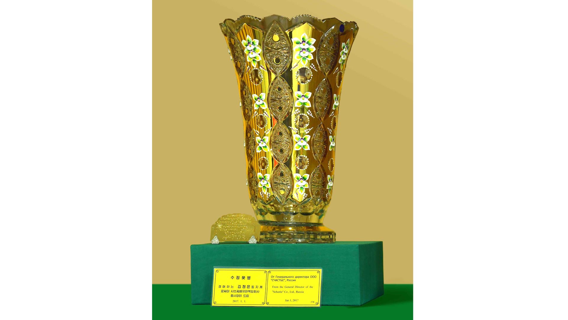 敬愛する金正恩総書記にチュチェ106(2017)年1月1日、ロシアのシャスチエ会社のワジム・アナトリエビッチ・タラセンコ総社長から贈られた水晶の花瓶です。