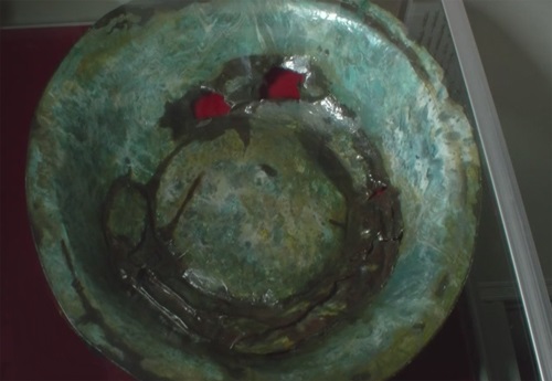 「厳しかった抗日武装闘争の時であるチュチェ29(1940)年3月の紅旗河というところでの戦闘のことです。この戦闘で、『討伐の王者』を自称していた悪質な討伐隊長の前田を始め、数百人の敵兵が紅旗河という谷間で遊撃隊の誘引待ち伏せ戦術によって全滅しました。戦闘の時、司令部の安全を思い、しきりに司令部の方に目をやりながら敵兵めがけて命中弾を浴びせていた女史は一群の敵兵が司令部のある山の尾根伝いに忍び寄るのを発見しました。女史は敵兵を誘き寄せるために司令部と反対の方向へと走り出しました。その時、女史の背のうに乗せてあったかなだらいに2つの銃弾があたり、このように跡ができたのです。ここに展示されているのが当時のかなだらいです」