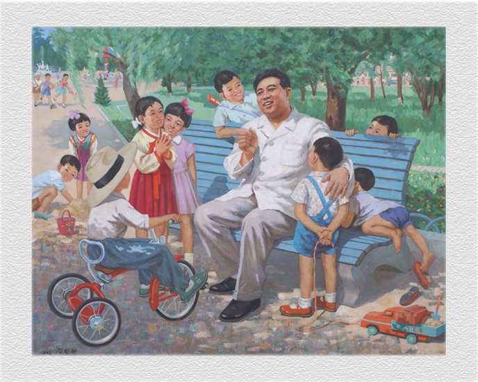 「この作品は、子供たちへの金日成主席の深い思いやり、そして、主席と子供たちとの血縁も同じ親しい間柄をそのまま表しています。主席は、わが社会では子供たちが国の王様だと言って、子供たちを一番愛し、大切にしました。主席は、作品にも描かれた児童公園だけでなく、国中に託児所、幼稚園、学校、少年宮殿も一番良い所に建てるようにし、子供たちのためなら何も惜しみませんでした。そして、国中の子供たちを訪ね、深い恩情を向けました。恵み深い主席の下で、子供たちみなが幸せに育ちました。それで、子供も大人も、人みなが主席を父と仰ぎ、心から信じて慕ったのです」