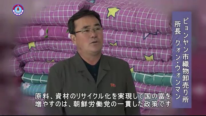 「原料、資材のリサイクル化を実現して国の富を増やすのは、朝鮮労働党の一貫した政策です。そこで私たちはニット、紡織、アパレルの各工場から出る廃品を利用して、国に利益を与えています。布切れや裁(た)ちくずで一般消費財の品種を増やしました。リサイクル化でただ同然に人民生活に役立つ色々な製品を生産することができました」