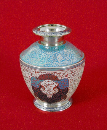 インドでは、昔から最も尊敬する方に貴金属の工芸品を贈る慣わしがあると言います。花瓶には、インドの伝統的な花模様と蔓模様の装飾が施されています。
