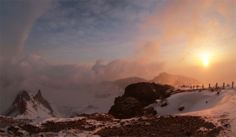 午前7時40分頃、白い霧を腰に巻いたペクトゥの霊峰と奇岩絶壁が美しい朝焼けに映え、見る見るうちに黄色がかった赤色、赤色と色濃くなる中、太陽が差し昇りはじめました。日の出のペクトゥ山は、激しい吹雪、突風、と変幻自在の極みでした。