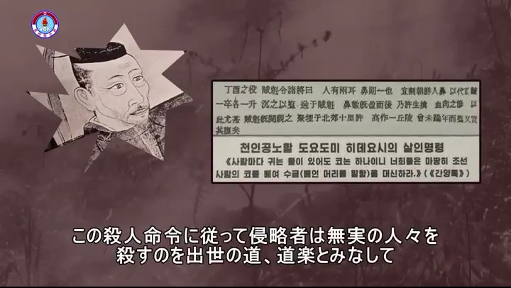 「当時、侵略の首魁だった豊臣秀吉は人の耳は二つだが、鼻は一つだから朝鮮人の鼻を切って首級に代えると言って切り取った鼻の数によって『軍功を評価』したとのことです。この殺人命令に従って侵略者は無実の人々を殺すのを出世の道、道楽とみなして『軍功』を立てようと、朝鮮人なら赤ん坊まで殺して鼻を切り取りました。果ては生きている人の鼻まで切りました。侵略者の野蛮行為によって戦後も朝鮮には鼻のない人が大勢いました。鼻塚にはこのように切り取った鼻が21万4752個も埋められたと言います。戦争が終わった後、日本侵略者は自分たちの残忍さと野蛮さを少しでも隠してみようと『鼻塚』を『耳塚』だと名を変えて歴史の記録に残しました。しかし名を変えたといって日本侵略者の野蛮行為の跡が覆い隠されるものではありません」