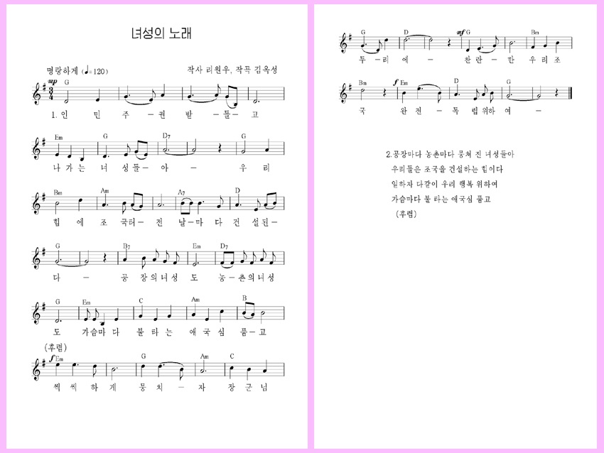 チュチェ36(1947)年に創作されたこの歌は、史上初めて人民政権の堂々たる主人となって新しい国造りに力と情熱の限りを尽くす朝鮮の婦人たちの愛国心を叙情的に歌い上げています。