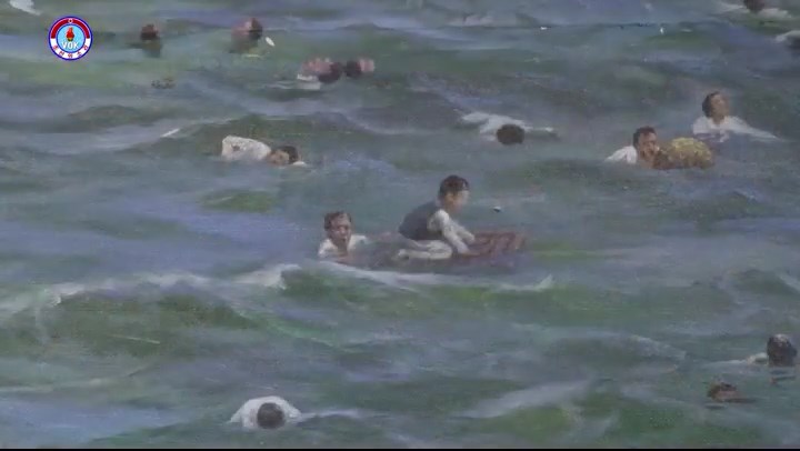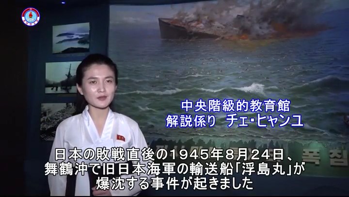 「日本の敗戦直後の1945年8月24日、舞鶴沖で旧日本海軍の輸送船『浮島丸』が爆沈する事件が起きました。この絵は当時の歴史的事実を表しています。当時、船には日本で奴隷労働を強いられた数千人の朝鮮人とその子女が乗っていました。日本当局の計略により、『浮島丸』は爆破され、数千人の無実の朝鮮人が海の藻屑となりました。日本はこの集団殺戮の内幕を永遠に闇に葬ろうと、かろうじて生き残った人たちまで海軍宿舎に閉じ込め、近くにある蒸気タンクを爆破して殺しました。敗戦の腹いせに、さらには、日本各地で朝鮮人に働いた蛮行の真相を覆い隠すためにこうした身震いする殺戮行為を働いたのです」