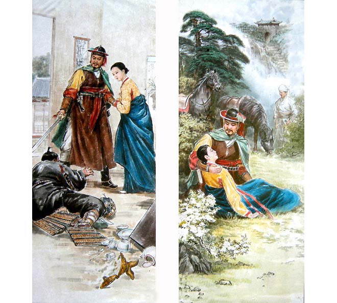 「戦争初期、ピョンアン道防御使だったキム・ウンソは、ピョンヤン城を一時占領した日本侵略者を駆逐するためピョンヤン一帯で決起した愛国的人民を結集して戦闘部隊を編制しました。一方、城内に残った愛国的な女性であるケ・ウォルヒャン*2と連係を結び、その助けで敵陣に潜り込んで敵将を殺し、敵軍を戦慄させました。総攻撃が開始された1593年1月のピョンヤン城奪還戦闘では先鋒隊長として勇猛を馳せました」