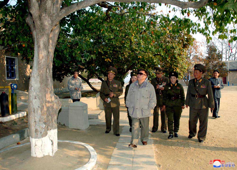 総書記が4回目に中隊を訪れたのは兵営の構内の柿の木に赤い実がたわわになっていたチュチェ95(2006)年11月初めのことでした。総書記は倒れんばかりに駆けて来る軍人たちと感激的に会いました。その間、中隊の兵士の皆が元気だったか、中隊で軍務に服して、他の所へ行った人たちも元気なのかと兵士一人一人の安否を尋ねました。この日、総書記は中隊の軍人皆が政治的・思想的に、また軍事技術的に、肉体的にしっかり準備されたことに満足の意を表しました。そして、中隊の各所を見て、兵士たちの芸術公演も鑑賞し、女性の海岸砲兵中隊は全ての面で全軍の模範だと高く評価しました。