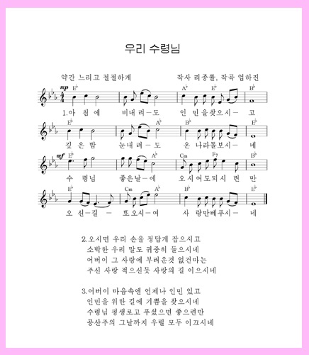 「われらの主席」、この歌はチュチェ78(1989)年、リ・ジョンリュル作詞、人民芸術家のオム・ハジン*1作曲で創作されました。
