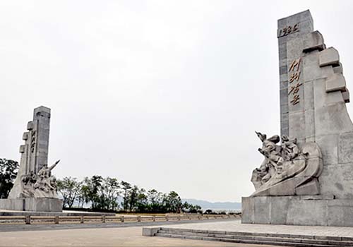 ここにあるハング旅館から西側に15キロメートルぐらい行きますと、西海閘門のダムが始まる門柱が見えます。門柱は西海閘門を建設した労働者と人民軍軍人の英雄的姿を表しています。