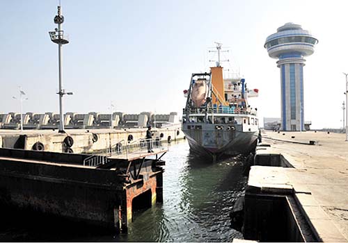 チュチェ75(1986)年6月に竣工した西海閘門には3つのロック室があり、数千トンから数万トン級の船が自由に出入りできます。ロック室の年間総貨物通過能力は数千万トンもあります。ロック室の上の回転橋には鉄道と車道、歩道があります。