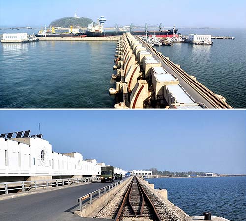 西海閘門*1は、偉大な金日成主席と偉大な金正日総書記の正しい指導の下、わずか5年と言う短い間に、朝鮮西海に流れ込むテドン川*2下流の8キロの海をせき止めて造った閘門です。