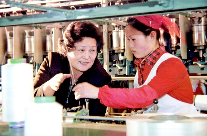 製織機に近づいて絹の質や色を計ってみ、織工たちの働く姿も見ました。製品見本室ではだんだら縞の布を始め色々な絹地を見て、女性たちが喜ぶだろうと言いました。この日、総書記は、人民が好む絹地の生産を大幅増やして、結婚する娘やチョンガー、60歳と70歳の誕生日を迎える年寄りたちに絹の衣服や布団を供給しなければならないといい、生産で困ったことを解決してやりました。工場を離れる前には生産を高い水準で正常化し、人民により多くの絹地を供給して、人民に愛される工場、人民に奉仕する工場になるよう念を押しました。人民という呼び名を何度も繰り返して、人民生活の向上のため腐心した総書記でした。