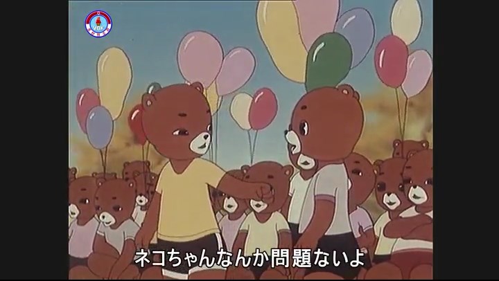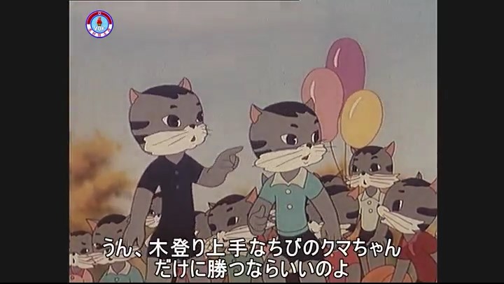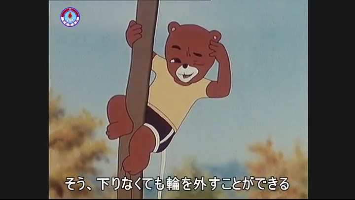 ※軽々と登るクマとネコ。ヒモが切れて落ちる。地面に突き刺さる竿。