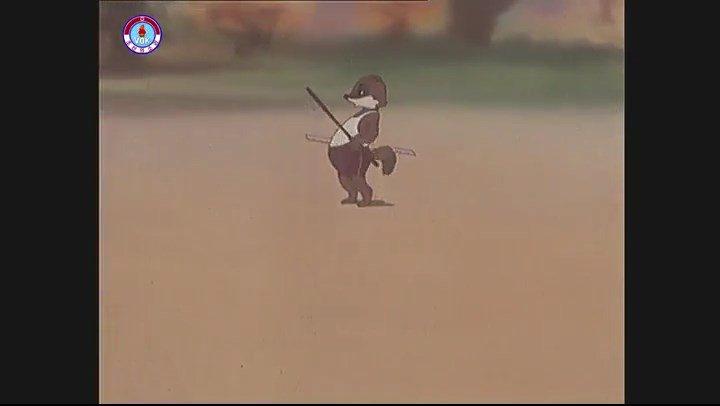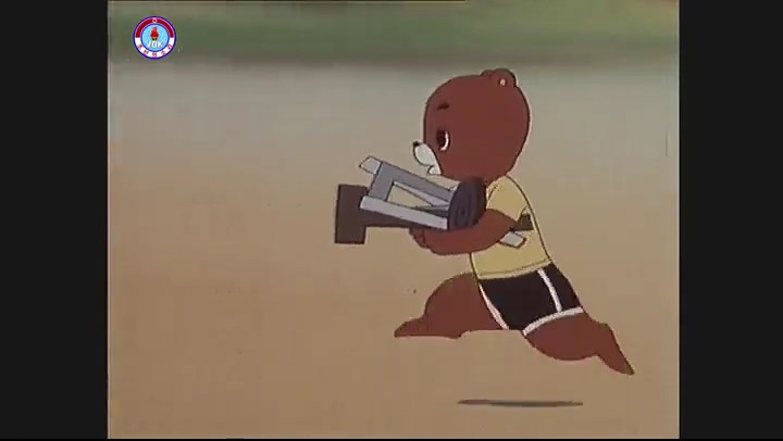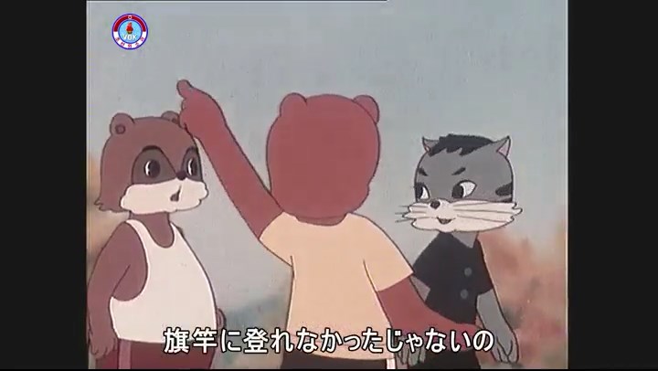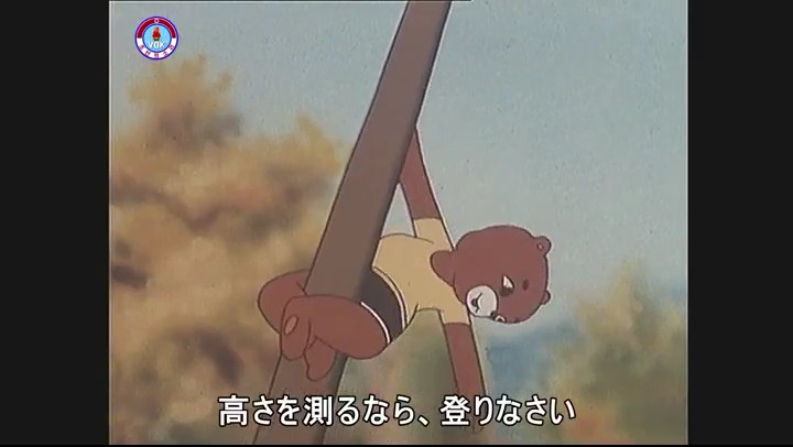 ※一番乗りのクマが巻尺の端を竿の下に留めて登り始める、追いついたネコも巻尺の端を竿の下に留めて登り始める。タヌキも追いつく。