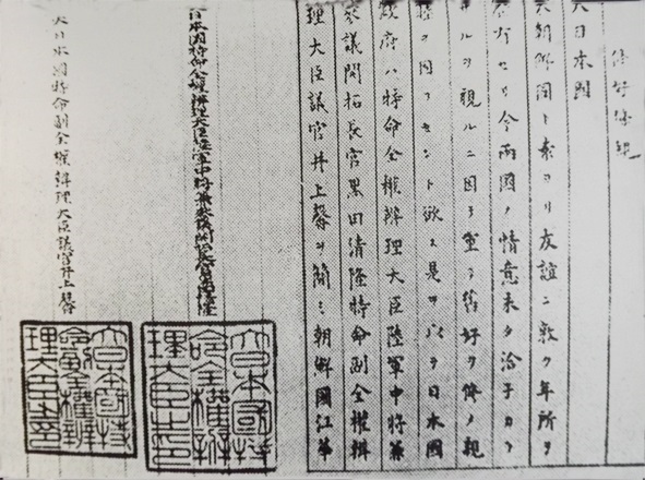カンファ島で締結されたことから、「カンファ島条約」、日本では江華条約と呼ばれるこの「条約」は、あくまで日本の一方的な権利と朝鮮の従属的な義務だけを規定した極めて侵略的で不平等な条約でした。