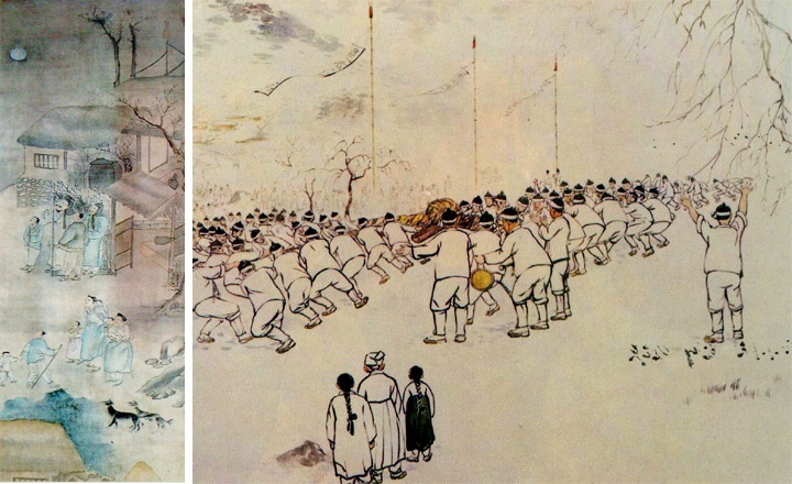 昔から人々は、この日に伝統の遊びを楽しみました。なかでも村人の団結力を示す綱引き、冬を越した害虫を燃やしてなくす遊び、子供の凧揚げ、風車はチョンウォルテボルムの雰囲気を大いに盛り上げました。