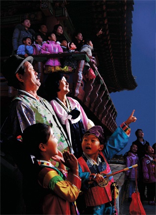 チョンウォルテボルムになりますと、朝鮮人民は来る年の幸運と豊作を祈り、色々な催しを行いました。代表的なのは稲とキビ、粟などを竿につけて家々の庭に立てることでした。そして月見はチョンウォルテボルムの風物詩でした。月見は、裏山に登ってお盆のようにまん丸なお月様を見物することです。昔から一番先に月を見る人は、その年に幸運に恵まれると言います。それで、誰もが一番先に月を見ようと競って山に登りました。