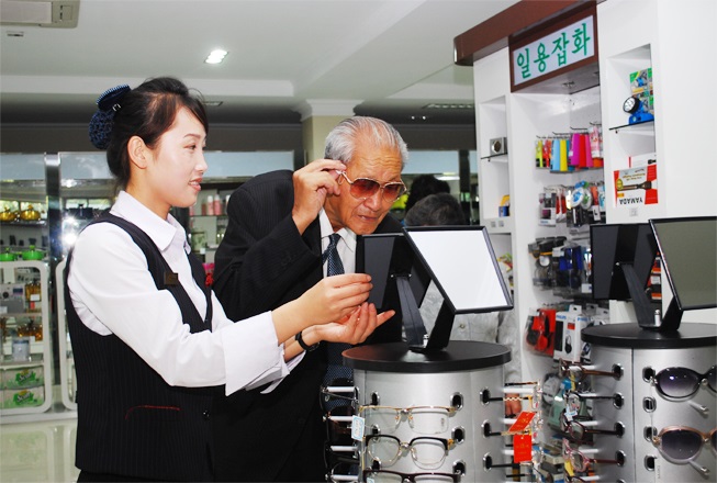 チュチェ101(2012)年1月、このショップを訪れた敬愛する最高指導者金正恩委員長は、各売り場を見て、ふと歩みを止めて日用品売り場でメガネを見ずに通り過ぎたと言い、踵を返してメガネの陳列台に行きました。