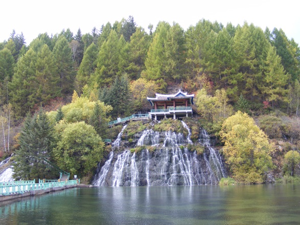 滝の上には東屋があります。滝は9筋に分かれて流れ落ち、その合間をまた数知れぬ小さな滝が流れています。本筋の滝は流れ落ちる途中、突き出た岩に当たって周辺を靄で包んだり、玉のような水しぶきになって流れます。また幾筋に分かれたり、1つの流れになったりします。