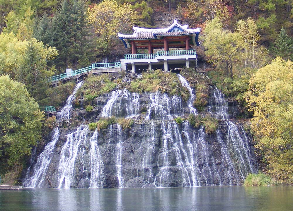その畔に地下水を水源とするリミョンスの滝*4があります。滝の落差は15メートル、幅は27メートルです。大きな滝が9つと、ビーズ暖簾をたらしたような小さな滝が無数にあります。大きな滝は流れ落ちる途中、突き出た岩にあたって周辺をもやで包んだりして、幾筋に分かれます。それがふたたび一筋になるところもあります。