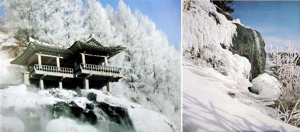リミョンスの滝は他では見られない珍しい滝なので、チュチェ69(1980)年1月、朝鮮の天然記念物に指定されました。滝の上にある東屋では美しい景色を眺めることが出来ます。
