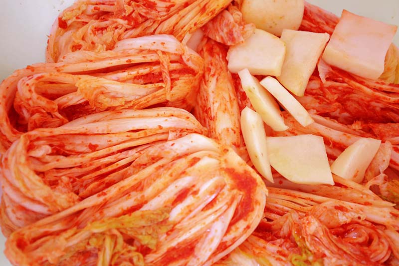 朝鮮民族の伝統の食べ物であるキムチは、白菜と大根、キュウリなどの野菜と山菜に唐辛子とねぎ、にんにく、しょうがなどの薬味と果物、魚、塩辛などを混ぜて乳酸発酵させた野菜の加工品です。