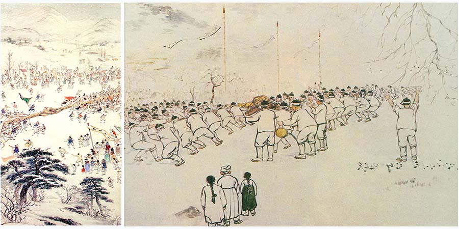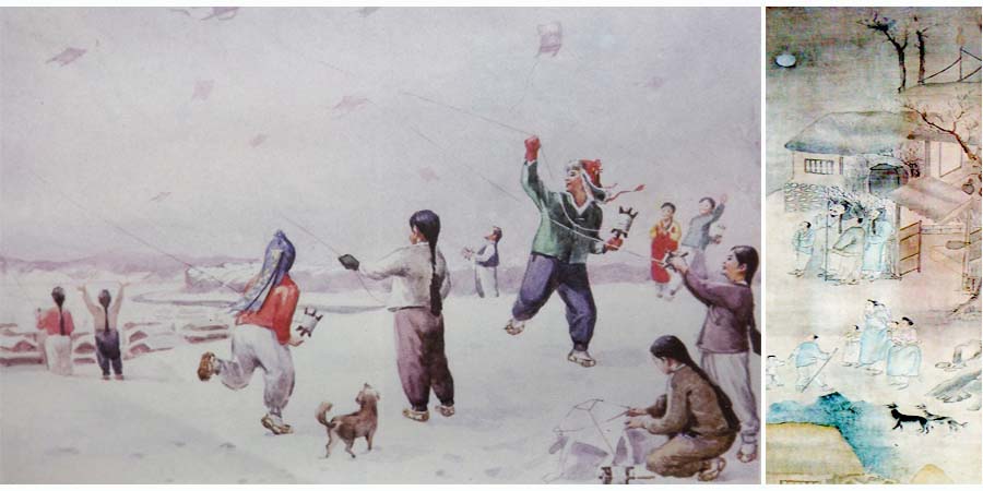 小正月の料理としては、五穀飯*1、ヤクパプ*2と言う薬の飯、9つの干し菜のおかず、飴、そしてポクサムと言って、乾かしたしらやまぎく、海苔のご飯包みが有名でした。すごろくに似ているユッ遊び*3とチャンギという朝鮮の将棋などは、祝日ムードを一層醸し出しました。綱引きと子供たちの凧揚げはその日の絶頂をなしました。