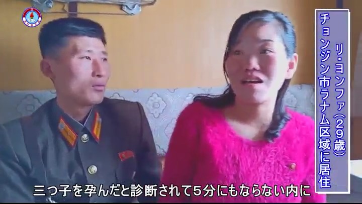 リさんに言わせますと「これまで数々の国家の特恵に預かって来たが、これからもそれが続く」との事です。これから数ヵ月後、三つ子の体重が4キログラムになるとリさんは赤ちゃんを貰いに、またまたピョンヤン産院に行く事になります。金の指輪をプレゼントされた女の子の三つ子は国家の負担で育てる事になります。三つ子の両親は娘達の明るい未来を確信しています。