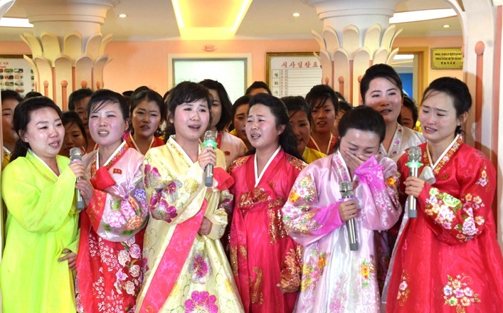 「今も金正恩委員長の計らいで設けられた祝宴に参加して、感涙に咽んでいた時のことを忘れられません。私たち糸繰り工に宮殿のような寮を建ててくれたその恩にまだ感謝の挨拶も差し上げられずにいるのに、施す温情は重なり、労働者を祝宴にまで招いてくれるのですから、金正恩委員長のような方はこの世にまたといないでしょう」