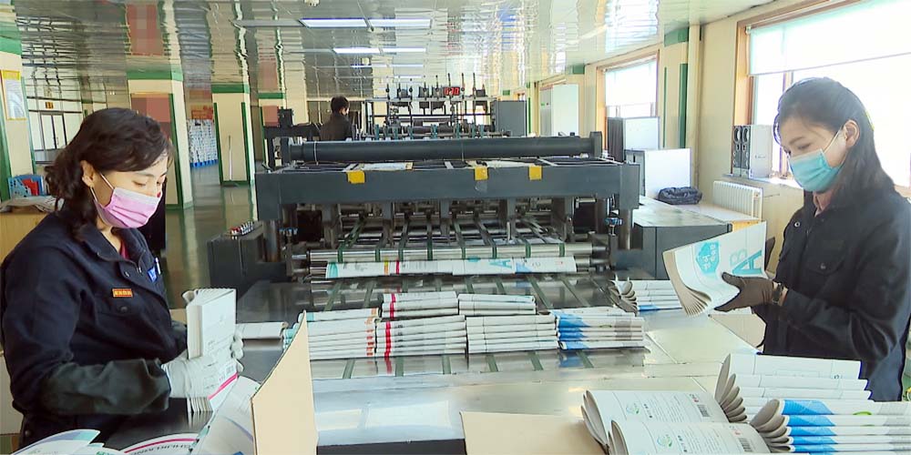 ピョンヤン高等教育図書印刷工場の人たちも、新学期を迎えて、国中の小学校、初級、高級中学校の生徒に送る教科書の生産を進めています。工場では科学技術に頼って印刷設備をフル稼働させています。