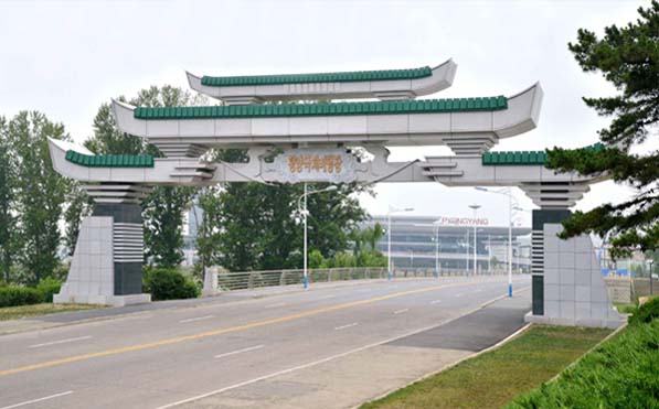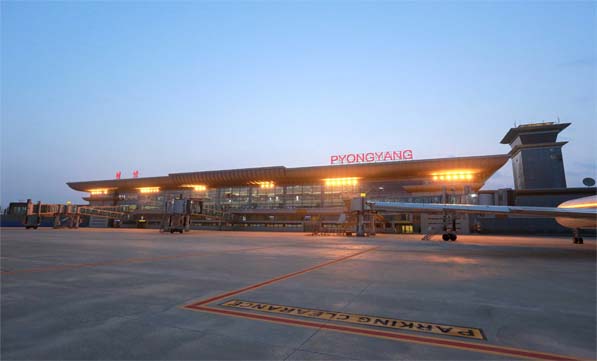 空路ピョンヤン入りする訪朝客が先ず目にするのはピョンヤン国際空港。伝統形式の入母屋屋根の門柱や朝鮮民族の気概を示す白虎を描いたターミナルビル、民族の情緒と現代感覚がマッチする空港を見て、誰もが朝鮮についてのイメージを描くものです。