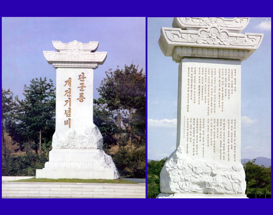 タングン王陵を改築して、朝鮮民族の英知と威容を世界に誇り示そうとの主席の大志は、偉大な金正日総書記の優れた導きによって見事に実現しました。総書記の細やかな指導の下にタングン王陵はタングン朝鮮の気概にふさわしく壮大に改築され、朝鮮民族の財宝、人民に限りない民族の誇りを持たせる文化財となりました。