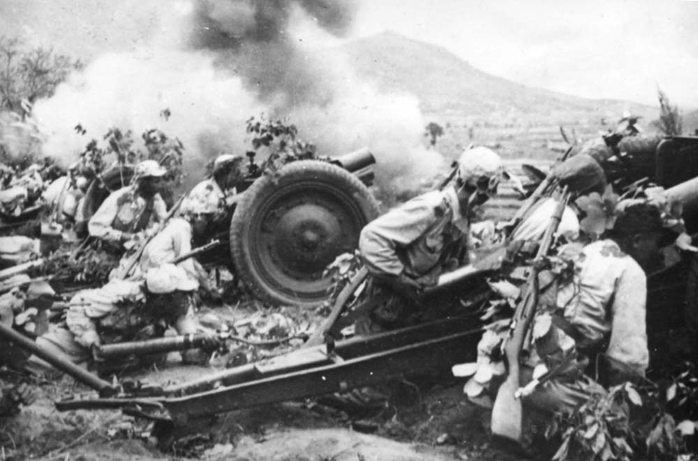 主席は独創的な反撃の戦略を打ち出し、立派に実現して、敵軍の不意の侵攻を一撃のもとに挫折させ、戦争初期から連続的な勝利をもたらしました。そして、坑道戦法、飛行機ハンターチーム運動、直射砲チーム活動を始め朝鮮の地形と現代戦の特性に合う独創的な戦法を編み出して、侵略者を絶えず掃滅し、弱化させました。