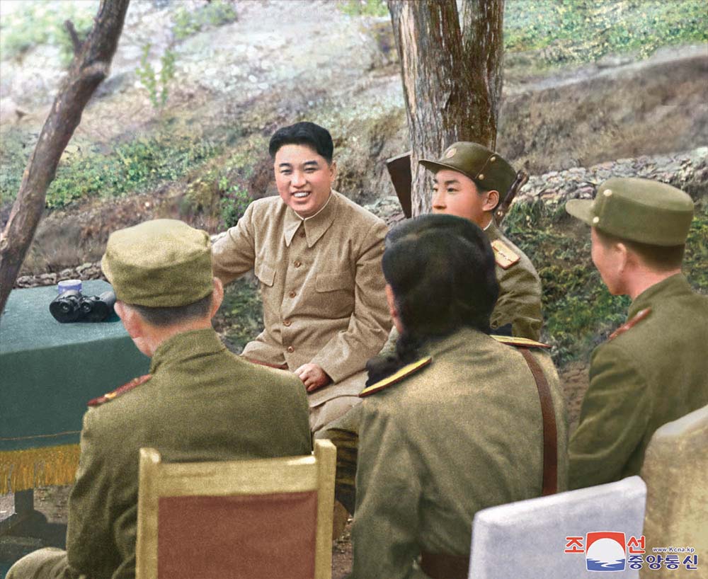「アメリカが朝鮮戦争を引き起こした時、共和国は創建されて僅か2年しかなりませんでした。生まれたばかりで、何もかも足りない国でした。ところが相手は侵略と戦争の元凶であるアメリカでした。武力の面でも、また既成の観念から見ても勝敗はすでに決められた、というべきでした。世界の進歩的な人々は不安と懸念を禁じ得ませんでした。しかし金日成主席は敵の数と技術の面での優勢を戦略と戦術の面での優勢で砕きました。戦争当初、主席のずば抜けた英知によって敵の攻撃を挫折させ、即時反撃に移って戦争開始3日目に敵の統治集団が居座っていたソウルを解放し、2ヶ月もならない短い間に南朝鮮地域の90パーセント以上、南朝鮮人口の92パーセント以上を解放しました。世界はこれを古今東西どの戦争史にもない現実化した奇跡だと驚嘆しました。それだけではありません。主席は戦争の各段階に正しい戦略的・戦術的方針を示し、その実現のための多様な戦法を編み出していたるところで勝利を収めました。世界に広く知られた1211高地戦闘の勝利はこの新たな戦闘方法、坑道戦法がもたらした輝かしい結実でした。そして主席は敵の空中優勢を制圧するための飛行機ハンターチーム、戦車ハンターチーム、敵の兵力を絶えず掃滅する狙撃兵チームなどの新たな戦法で敵を絶えず掃滅し、弱体化させました。文字通り、偉大な軍事戦略家である金日成主席が示した戦略戦術と戦法は現代の戦争史にも、どの国の兵書にもない全く新しいものでした」